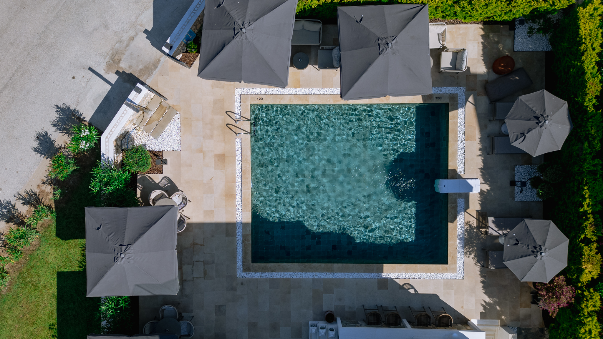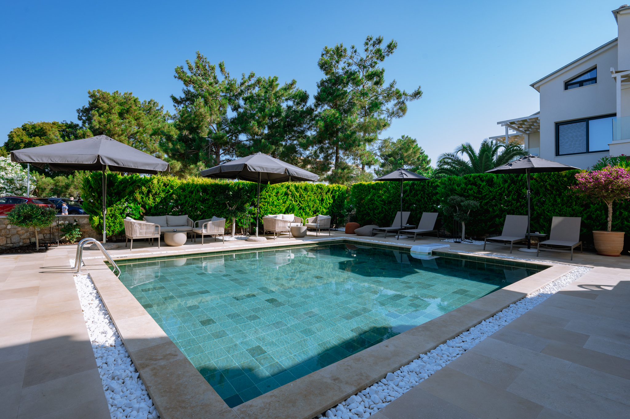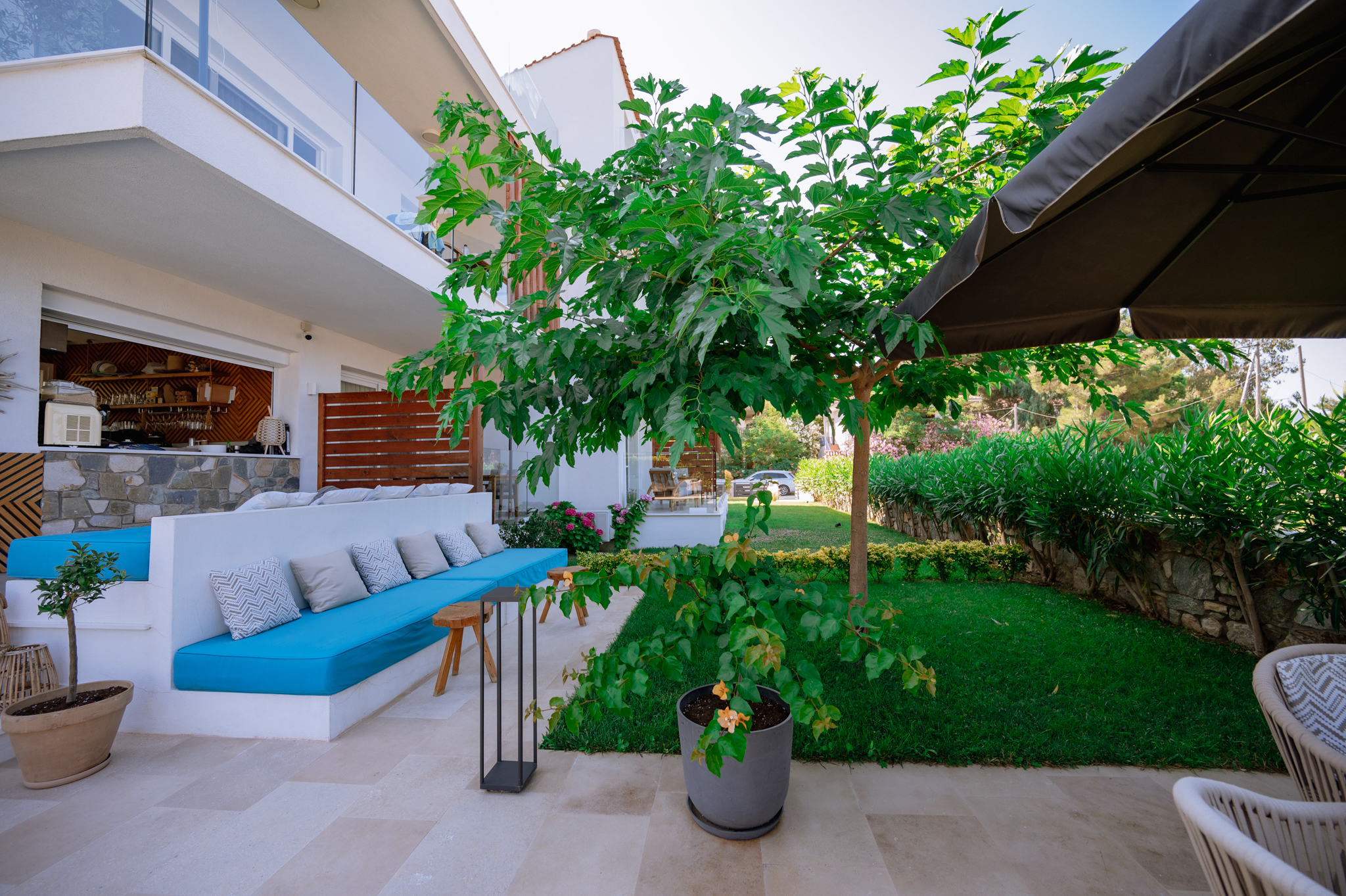 Sentimento, an oasis of elegance, showcases a design with the exquisite beauty of natural Thasos marble, infused with sea-inspired elements painted in captivating shades of sea blue. Immerse yourself in a world where the harmony of nature and coastal aesthetics come together, creating a serene and enchanting atmosphere that invites relaxation and rejuvenation.